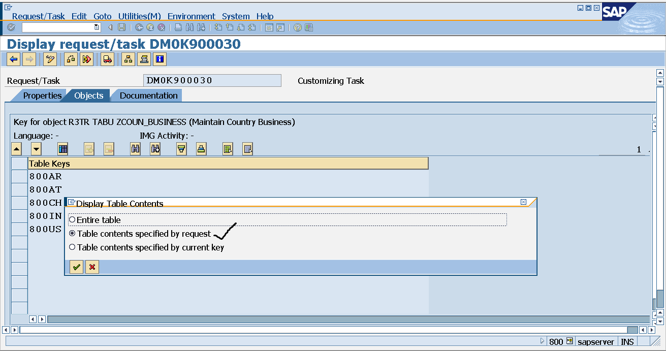 Step36. Select the Customizing request where our table entries are stored.