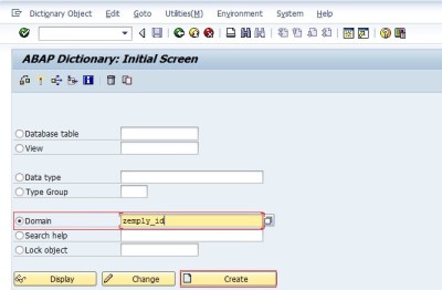 Step 1. Go To TCODE- SE11, Select the ‘Domain ‘ radiobutton , provide the Domain name and Click on the ‘CREATE’ button.