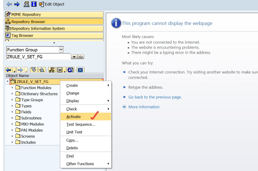 Step23. Go to Tx- SE80 and open the function group. Double click on the function group name and its status is inactive.