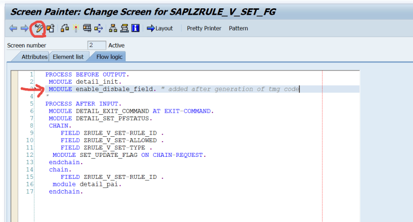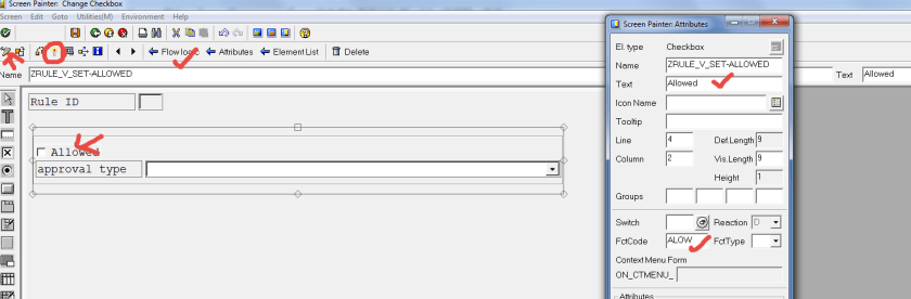 Step14. Click on change mode. Double click on the check box, provide the text and function code. Activate and lastly click on Flow Logic button.