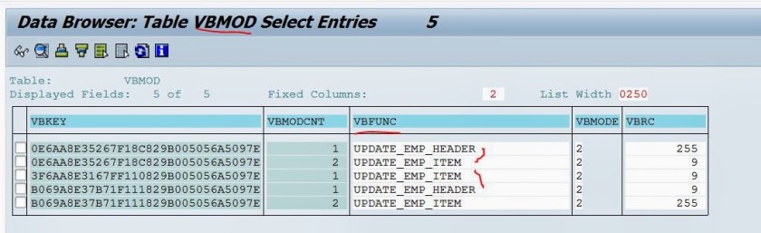Step36. The debugger stops at this point. There are some DB tables that holds UPDATE FM call, data for temporary period of time.  The tables are VBHDR, VBMOD & VBDATA.