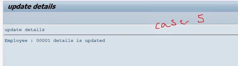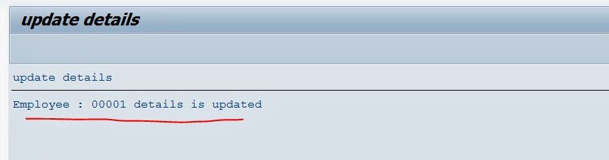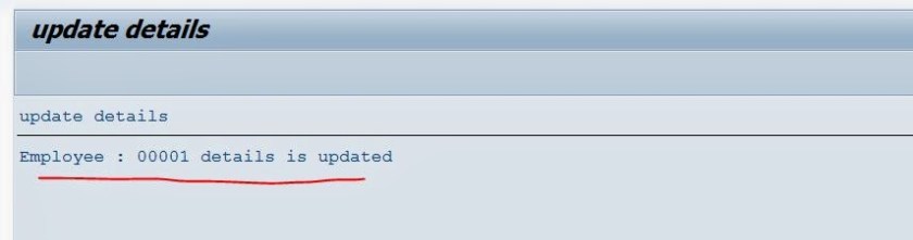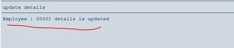 WRITE :/ ‘Employee :’, ls_emp_hdr-emp_id , ‘details is updated’.