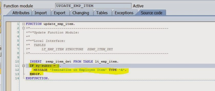 Step48.  Go to the ITEM update FM and put some extra code. Put a Message type ‘A’ to fail the DATABASE update.