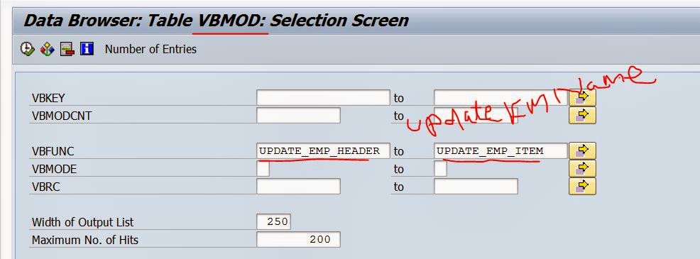 Step41. Go to the VBMOD table in SE11 and provide the update FM names .