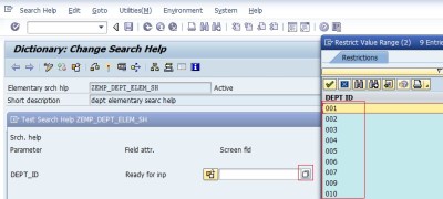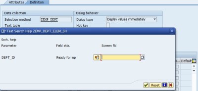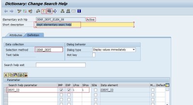Step 3 Provide the short text. In the selection method provide the table name from where the set of values we will get. In this case the table is ‘ZEMP_DEP’ is used. ( see the table creation of table in the previous post). In the Search help parameter, press F4 button and it will show all the fields of table ZEP_DEPT . Select the DEPT_ID field of the table. Select the IMP and EXP and maintain 1, 1 in the LPos and RPos. Activate the search help and click on the EXECUTE/F8 Button to test the search help.