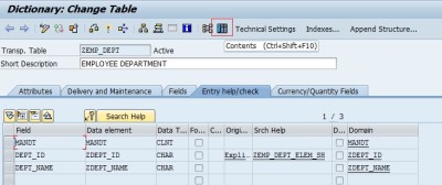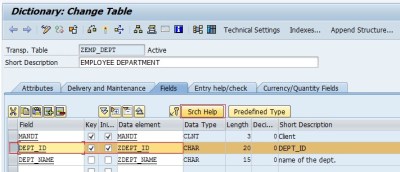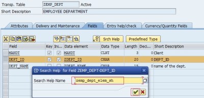 Step 6. Let’s assign the created search help to the Table. Go to TCODE- SE11, provide the table name ‘ZEMP_DEPT’ and click on the change button.