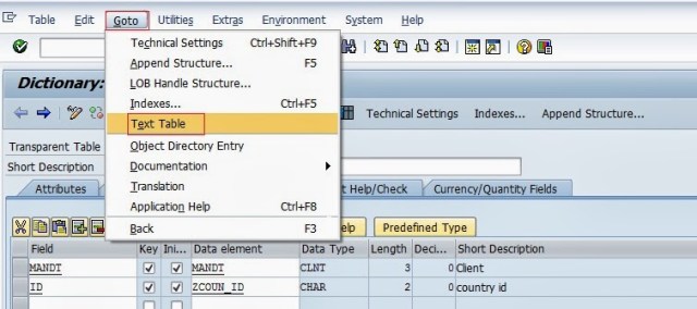 Step23. Now go to the Main table ZCOUNTRY. Click on the menu Goto and press text table.