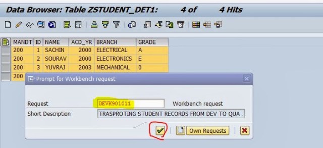 Case 2: Creating the table and then creating the table TMG and adding the records and then transporting the records from Dev system to Quality system.