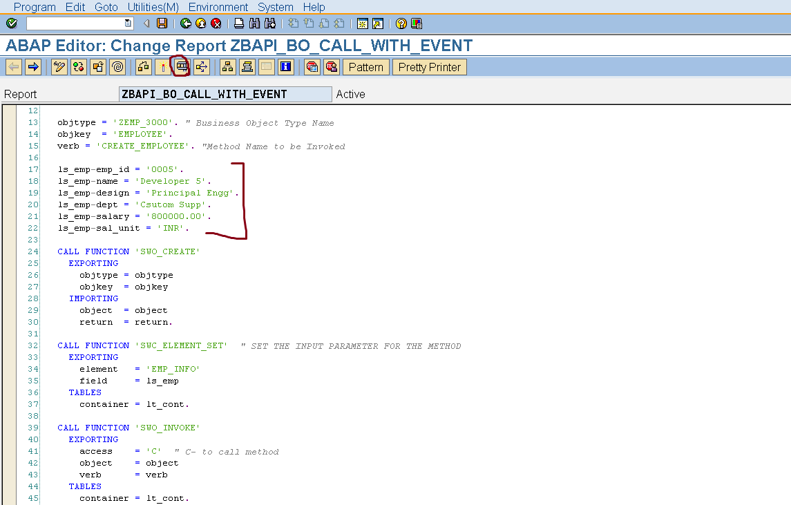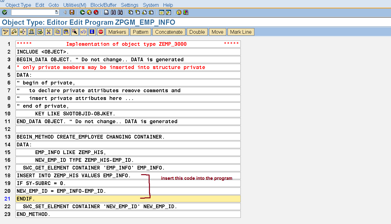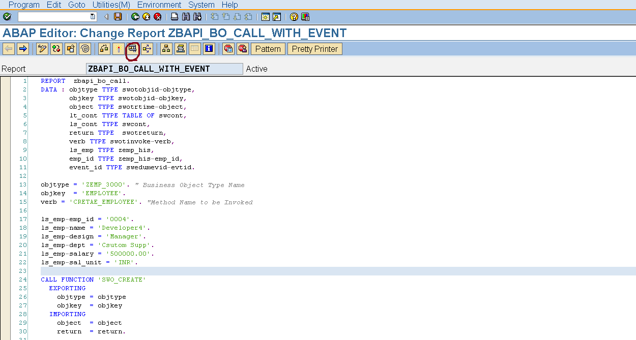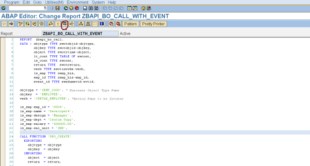Step46. Provide the below code. The objective is BO method will create a Employee record without filling some field here like CREATED_VIA field and will trigger event for which a FM will be called and it would filled the field CREATED_VIA.