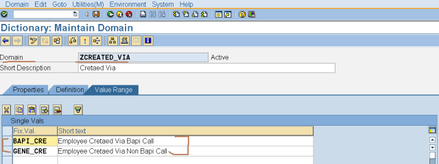 Step2. For the Data Element : ZCREATED_VIA, create a domain ZCREATED_VIA and maintain two domain fixed values.