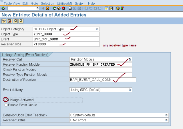 Step50. Provide the BO name, event name, Receiver type we can put any name. Receiver FM provide the above created Function module and Destination as our RFC Destination in SM59. Save it.