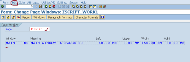 Step4. Go to the Script and open the windows tab. Here we will add a variable window to show our invoice types, because MAIN window will flow to multiple pages depending its content but VAR window will remain on the single page only with variable content. Go to the EDIT menu.