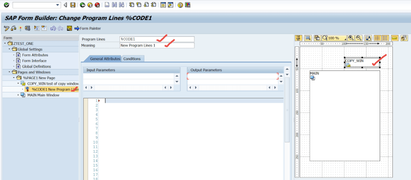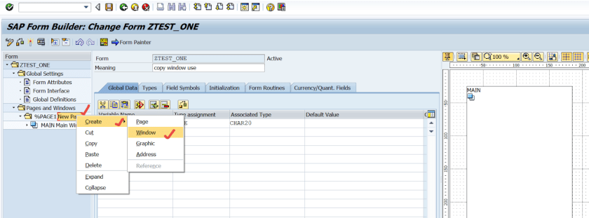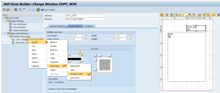 Step8. Now we are done with the copy window creation and positioning on the smartform page. Now right click on the copy window and from the shown navigation, create program lines.