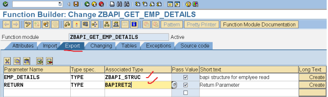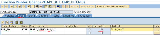 Step9. Provide the below fields in the Importing section. As this is Remote Enabled FM so the all parameters should be pass by value.