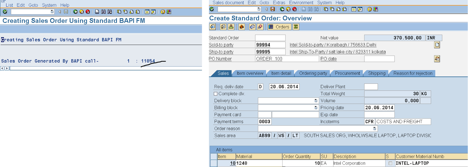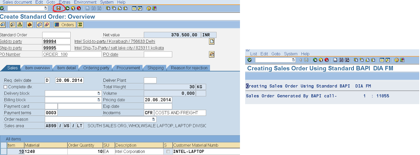 Step6. The first one directly creates the Sales Order & the other Dialog BAPI calls the transaction VA01 and waits for the user action like Save or modifying something in the Screen.