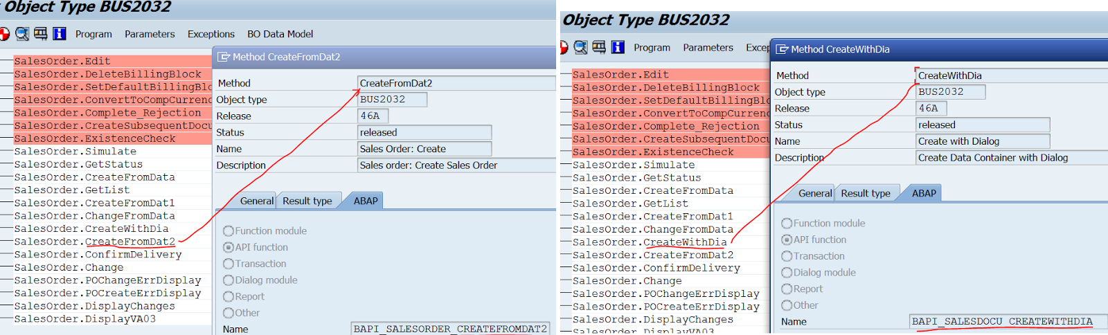 Step1. Go to Tx- SWO1 & open the BO- BUS2032 Sales order. The two methods creates the Sales Order but one without dialog mode and other is with dialog mode.