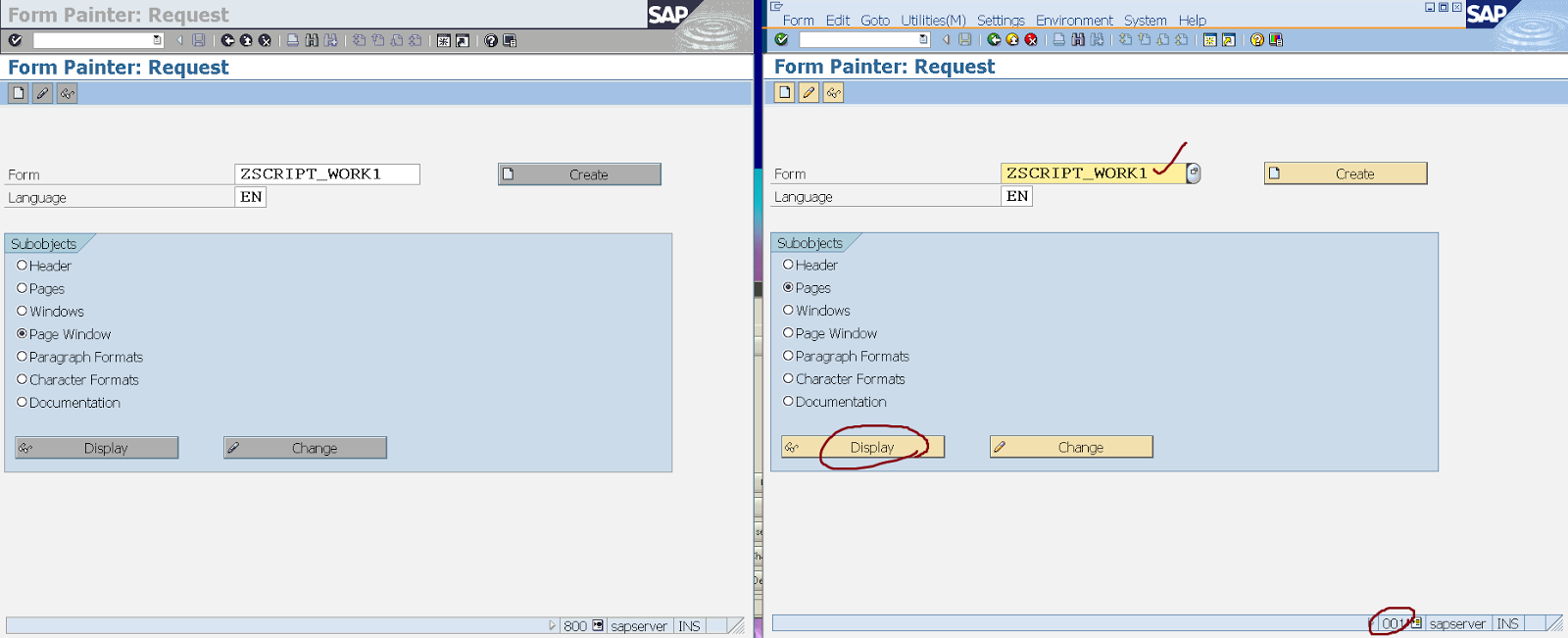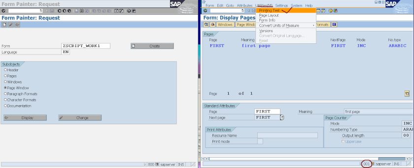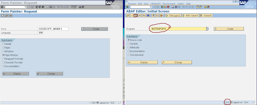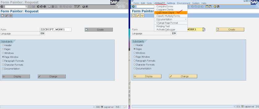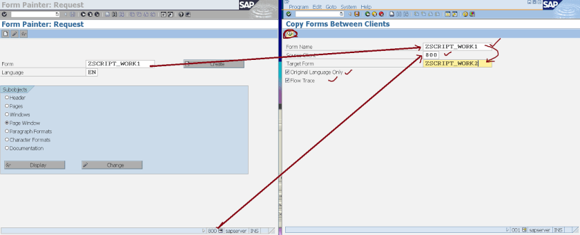 Step1. So here we logged in two clients 800 and 001 of the same systems. The SCC4 tcode shows all the clients in the system. Lets copy the form available in client 800 to the target client 001.