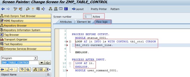 Step 9. Provide the flow logic of the screen ‘0001’ containing the table control. Add the Loop and Endloop statement in the PBO and PAI of the screen which contains the table control. The Loop and Endloop statement in the PBO is used to read the value from the internal table and fill the table control through the work area. The Loop and Endloop statement in the PAI is used to process the record that are in the table control if the user performs some action like updating or modifying the existing records.