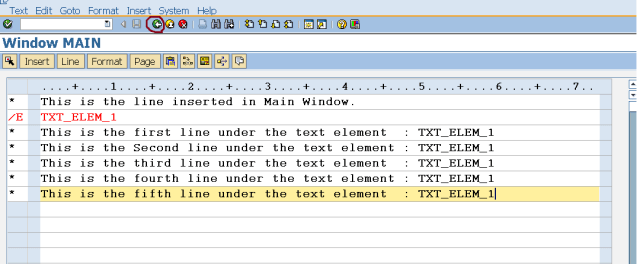 Step3. From the left side F4 value, choose /E for text element and give a text element name . In this case the text element name is ‘TXT_ELEM_1’ & under that write some line. These lines are come under text element ‘TXT_ELEM_1’ . Go back.