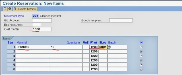Step3. Provide the cost center and Material number, quantity, plant and storage location. It signifies that this plant needs material for the Maintenance activity.