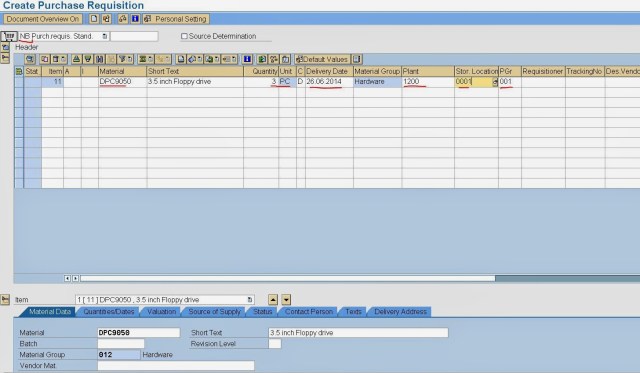 Step9. The below Pur Requisition is generated which can be displayed in ME53N.