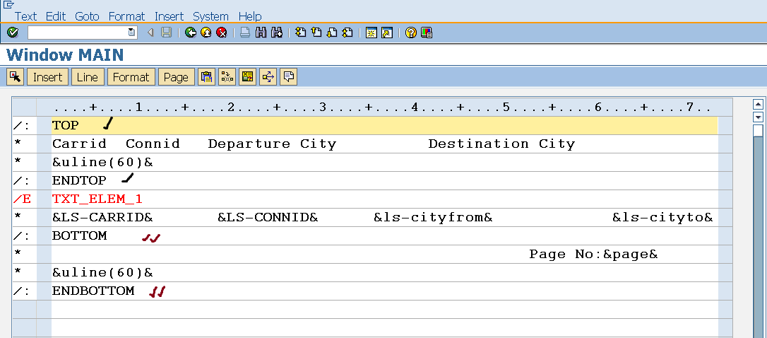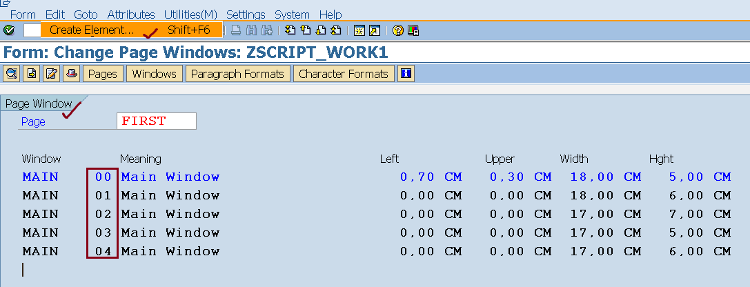 Step1. Here the script contains only one MAIN window which is added to the page windows. Fix the MAIN window height as 5 CM. Select the MAIN window and click on the TEXT Element button.