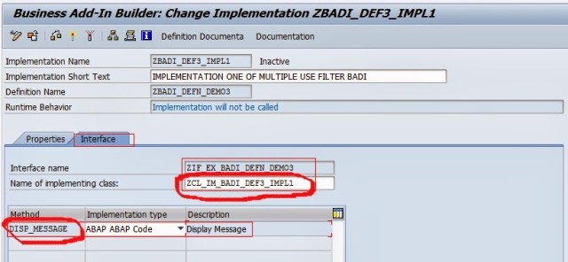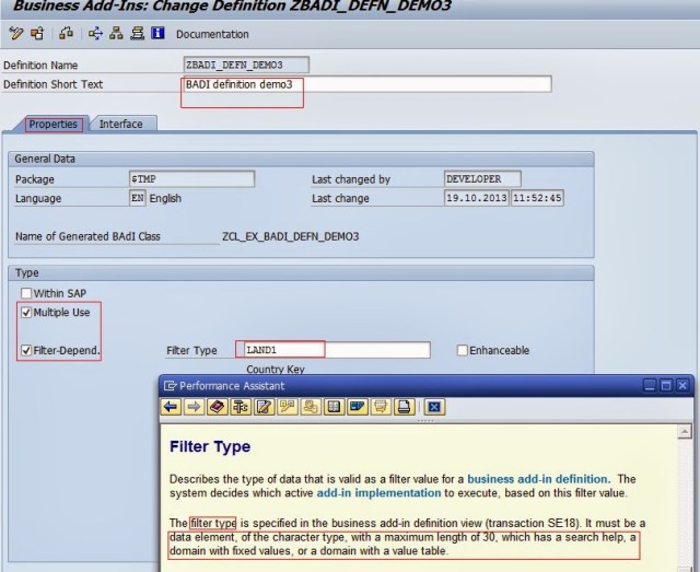 Step3. Provide a short description. In the properties section, the system automatically generates a BADI Class based on the BADI name. In the TYPE section, select multiple use option which indicates that this BADI can be used for multiple implementations and also select Filter-Depend. Provide a Filter Type as LAND1(country dependent filter). As per the information provided , the filter type should be a DATA ELEMENT . Click on the Interface tab.