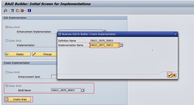Step6. Creating a BADI Implementation. Go to TCODE – SE19. Under the CREATE Implementation Section, Select the Radio button classic badi and provide the BADI definition name created above and click on the Create Impl. button and it ‘ll show a popup screen . Provide the Implementation name as ‘ZBADI_DEF3_IMPL1’ and click on the continue button.