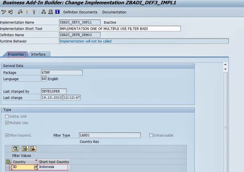 Step3. Provide a short description. In the properties section, the system automatically generates a BADI Class based on the BADI name. In the TYPE section, select multiple use option which indicates that this BADI can be used for multiple implementations and also select Filter-Depend. Provide a Filter Type as LAND1(country dependent filter). As per the information provided , the filter type should be a DATA ELEMENT . Click on the Interface tab.
