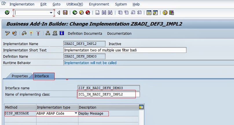 Provide the Implementation name as ‘ZBADI_DEF3_IMPL2’ and click on the continue button.