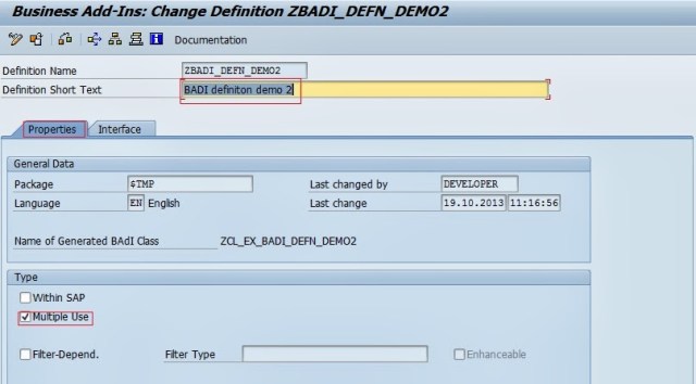 Step3. Provide a short description. In the properties section, the system automatically generates a BADI Class based on the BADI name. In the TYPE section, select multiple use option which indicates that this BADI can be used for multiple implementations . Click on the Interface tab.