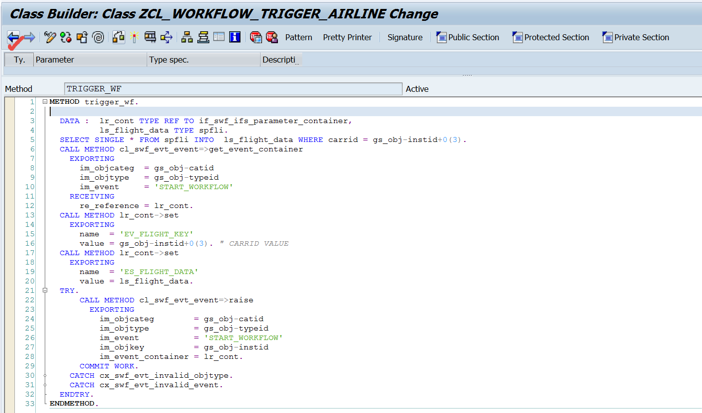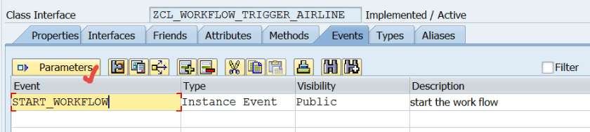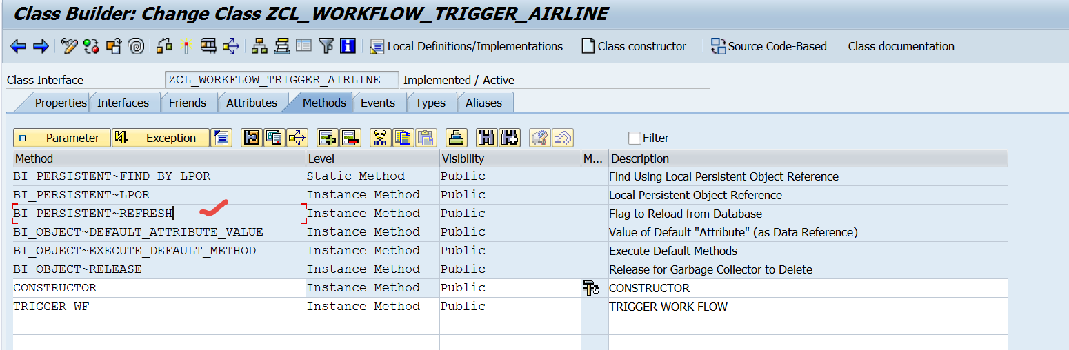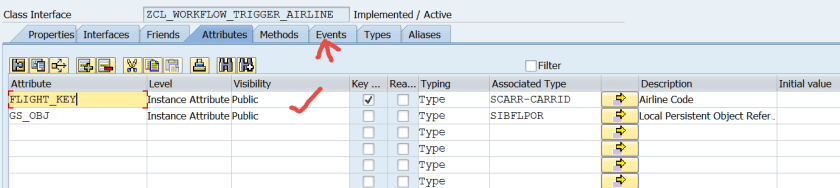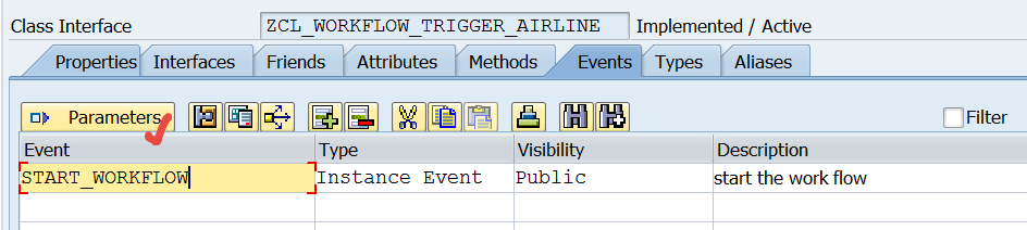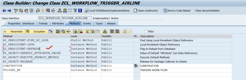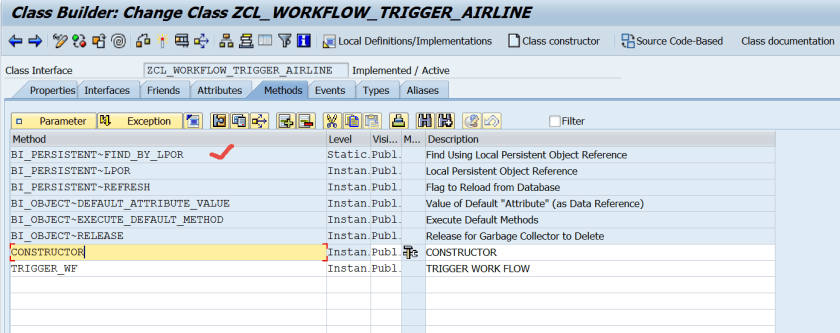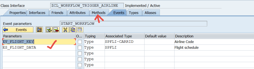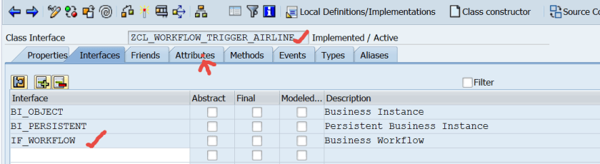- Create a class in SE24 and implement the interface IF_WORKFLOW.