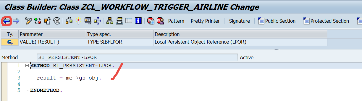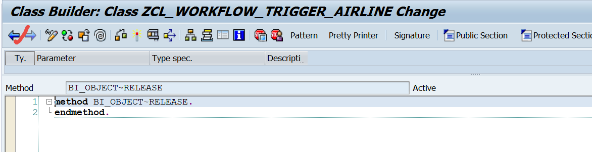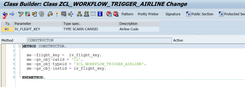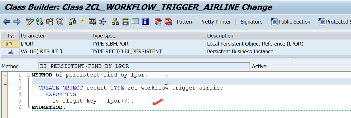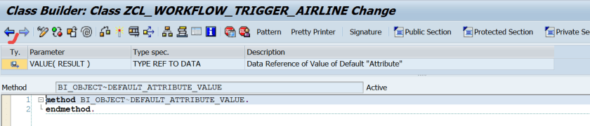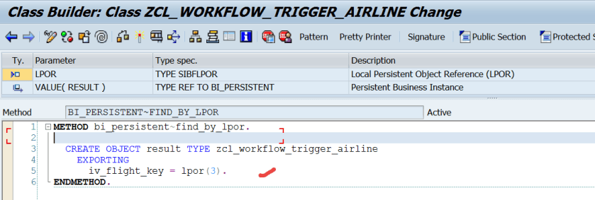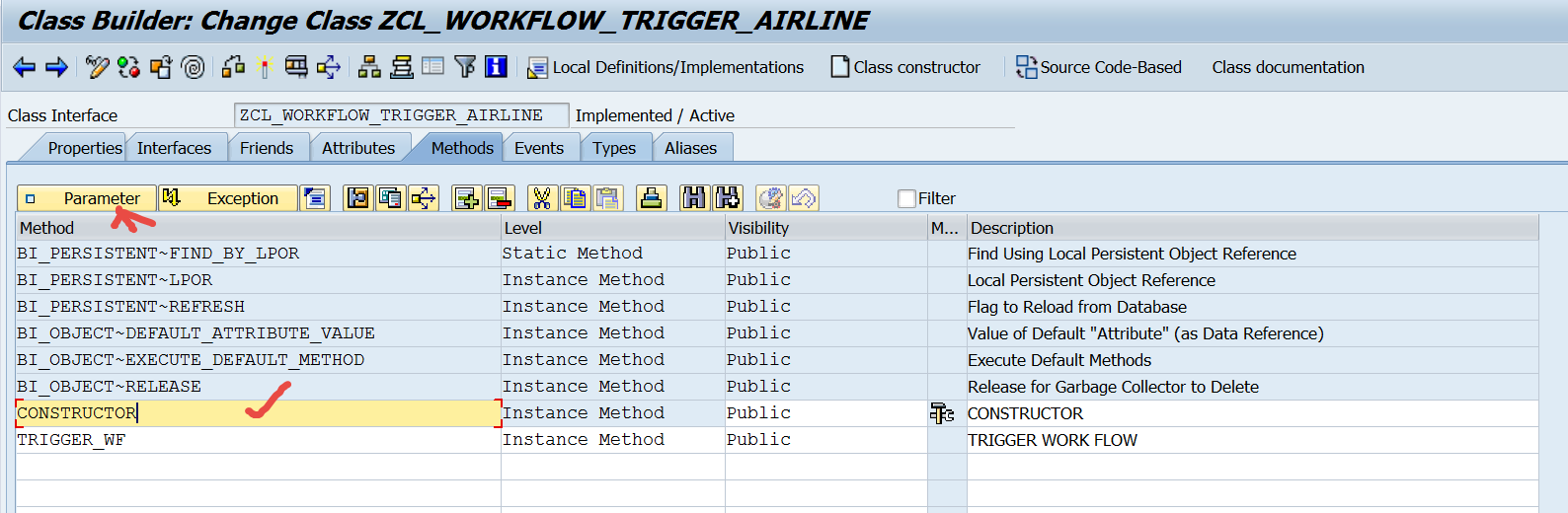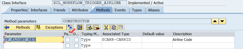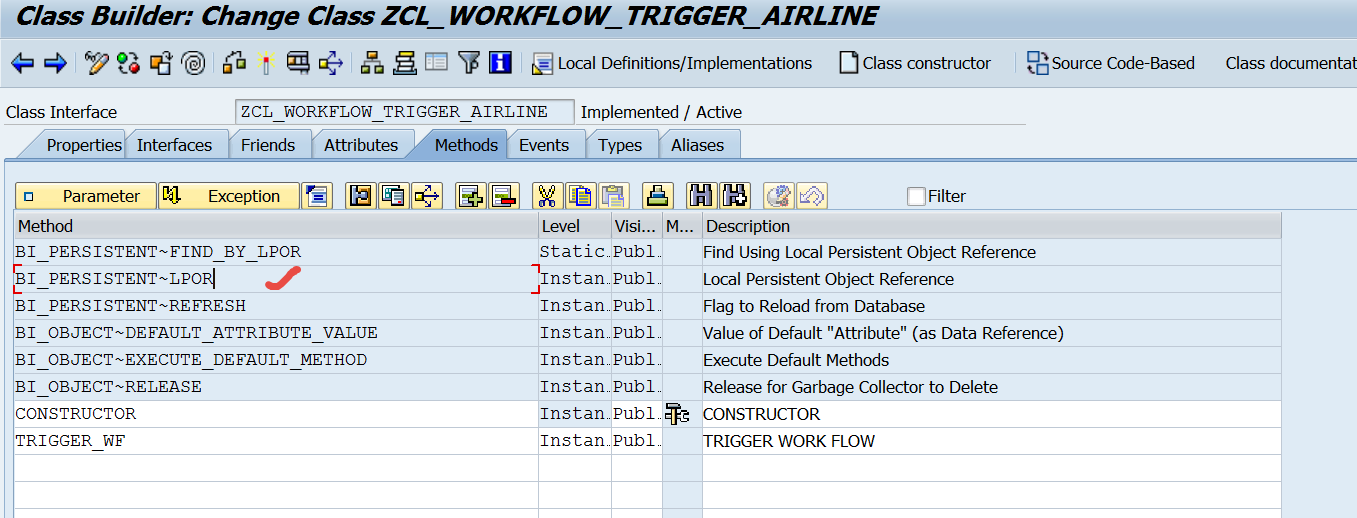 - Create a class in SE24 and implement the interface IF_WORKFLOW.