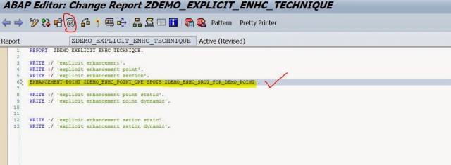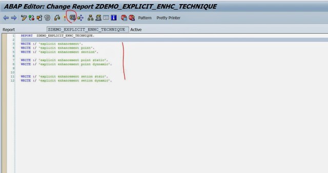 Step6. One new line is inserted at the selected point in the program. Now the enhancement point is created but we need a enhancement implementation to put our specific code. So click on the Spiral icon to enter into enhancement mode.