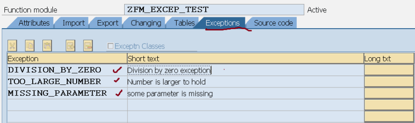 Step3. Here define the exceptions to be raised in the FM source code under the Exceptions tab.