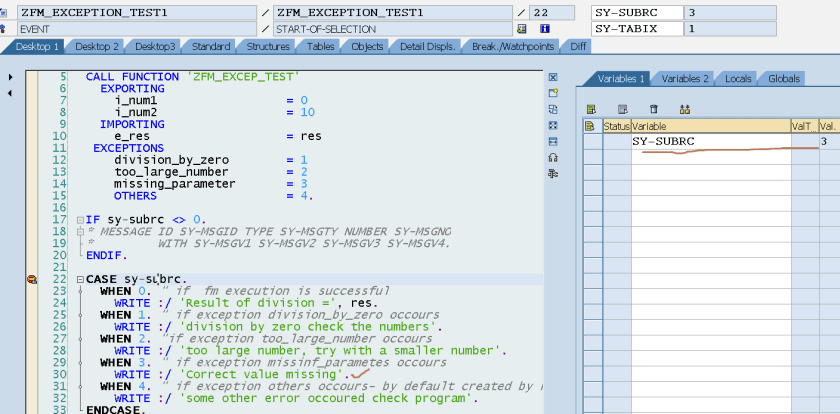 Step5. Here we have the program that calls the FM with specific set of parameters. When you call this FM automatically the system assigns a integer value to each of the exception. When in the FM source code a particular exception is raised then the sy-subrc value is the value assigned to the exception.