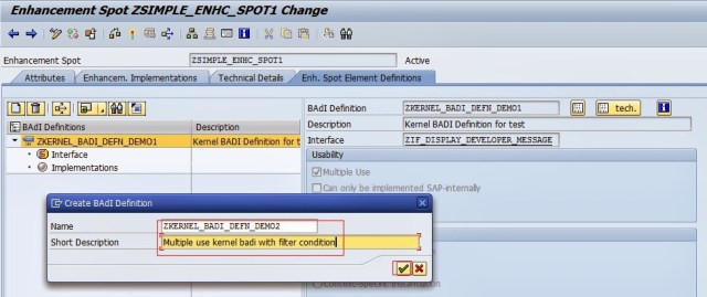 Step3. Now the BADI definition is created with name ‘ZKERNEL_BADI_DEFN_DEMO2’ with multiple