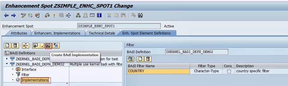 Step8. Up to this point BADI definition with interface and filter is created. Now create the BADi implementation. Expand the BADI definition. Select the implementation and click on the cretae implementation button as highlighted.