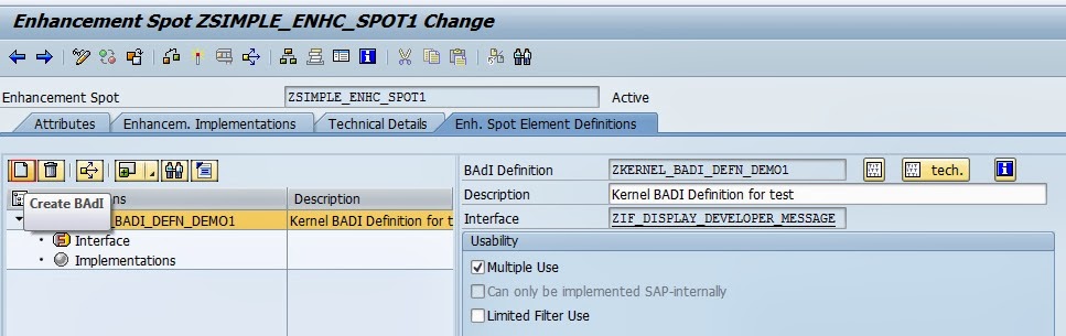 Step3. Now the BADI definition is created with name ‘ZKERNEL_BADI_DEFN_DEMO2’ with multiple