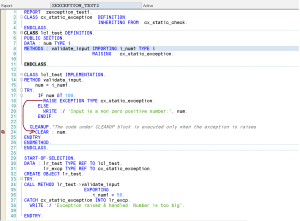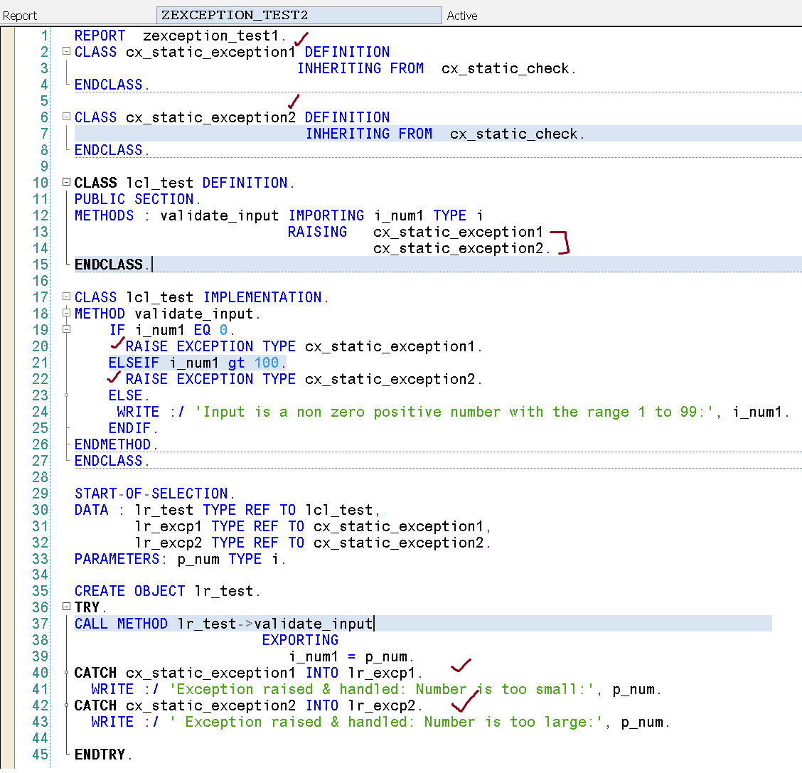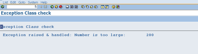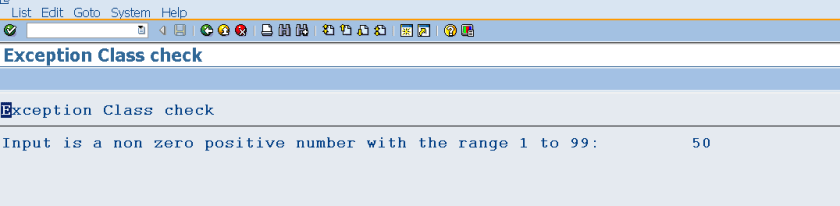 Step1. So here we have the program with two exception classes. based on some condition two different exceptions are raised in the VALIDATE_INPUT method. The exception is handled in where the VALIDATE_INPUT method is called with Multiple CATCH statement in the TRY ENDTRY block. Run the program with different sets of inputs.