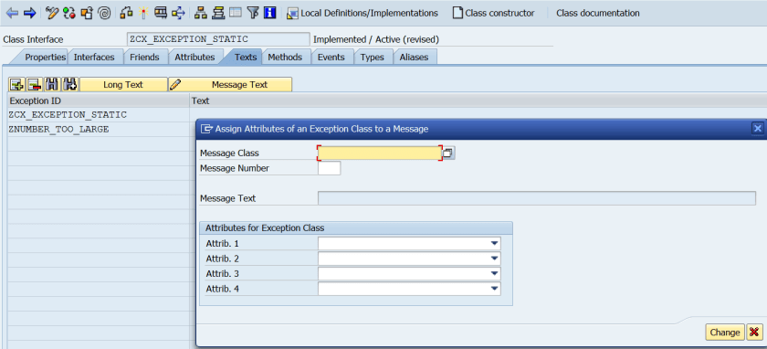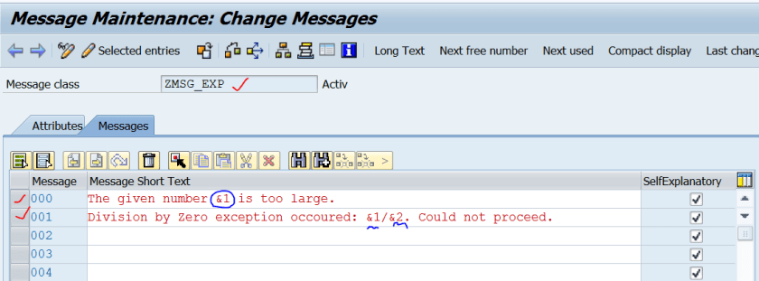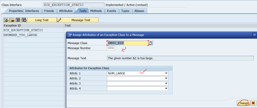 Step12. Provide the message class name and message number ‘000’ and hit enter key. Then click on the drop down to select already created attributes in the exception class. So in this way the attributes defined in the exception class is mapped to the message class message text place holder.