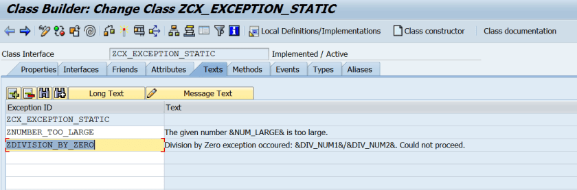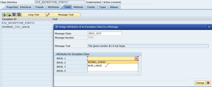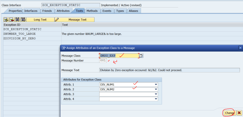 Step17. So from the appeared screen, select the message class name and message number. Then hit Enter button. From the attributes of Exception class, from the drop down select already defined attributes DIV_NUM1 and DIV_NUM2.