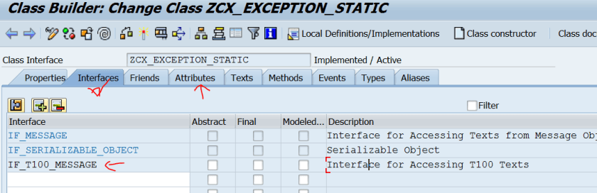 Step4. As we have selected WITH MESSAGE CLASS so one interface IF_T100_MESSAGE is implemented in the exception class. Click on attributes tab.
