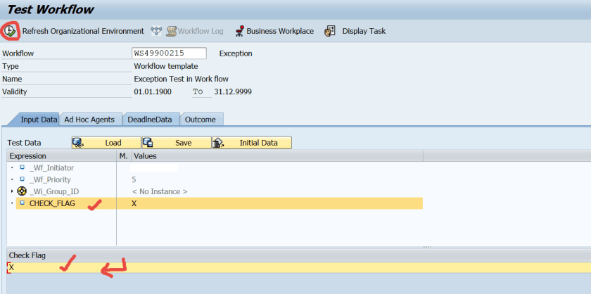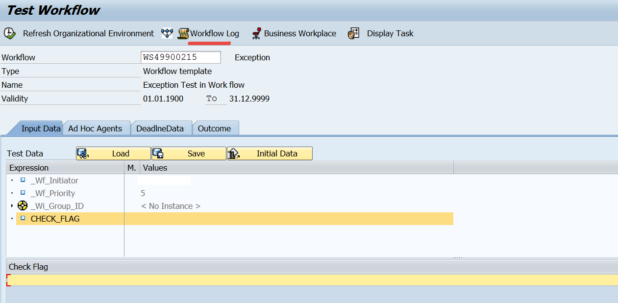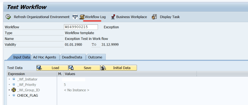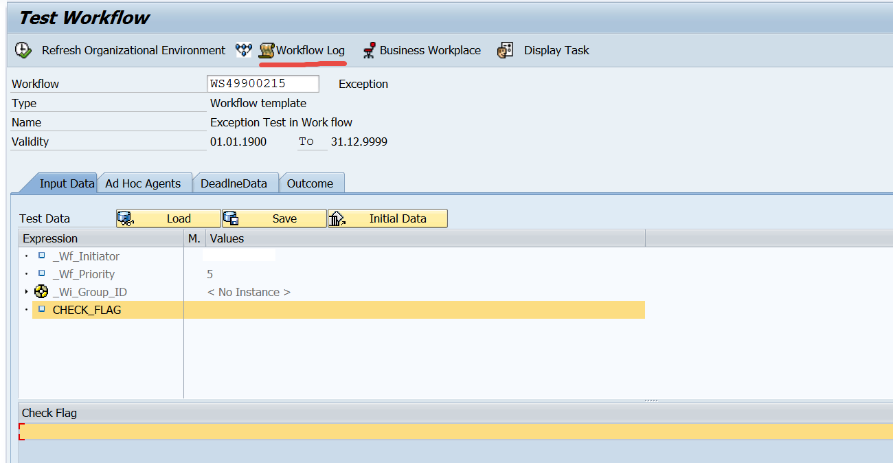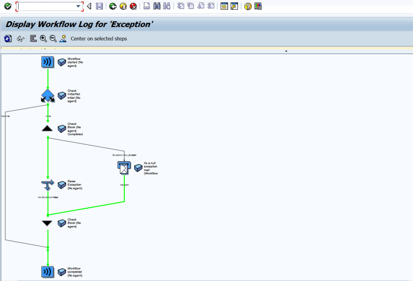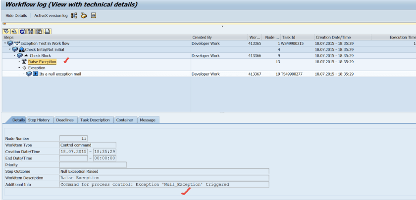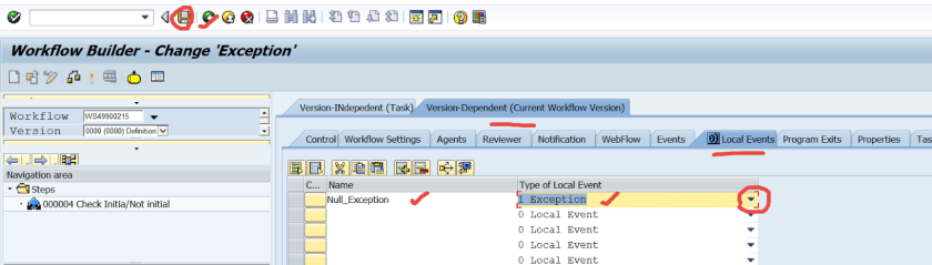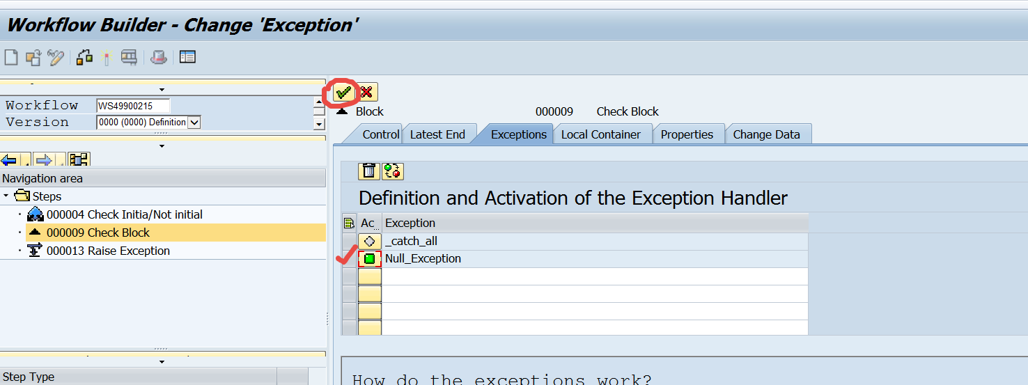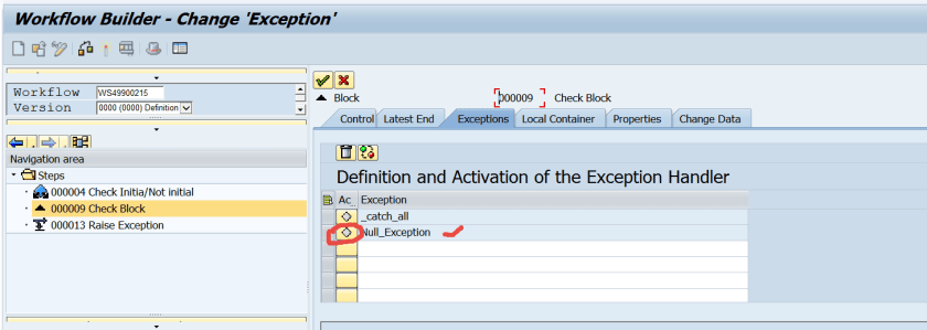 - Go to the Exceptions tab. here already the defined exception NULL_EXCEPTION is present that we have defined in the WF header.