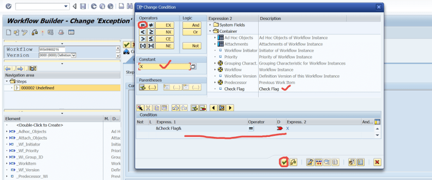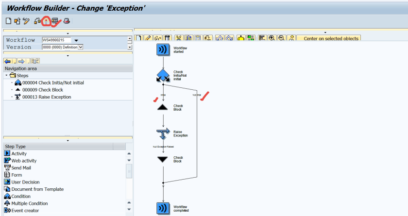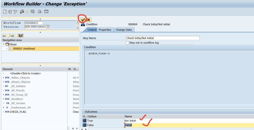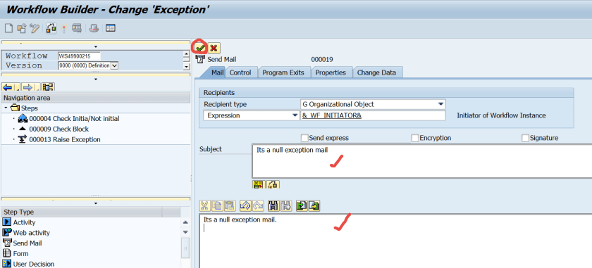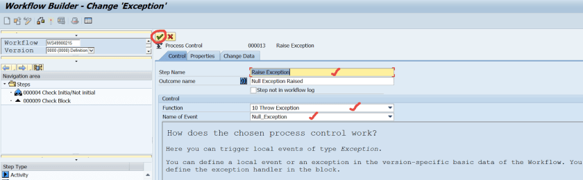 - Provide step name, outcome name. Function as Throw Exception and name of the exception as NULL_EXCEPTION that we already defined in the header of the work flow. So now if in the condition the value of the container parameter is null then it raises an exception.