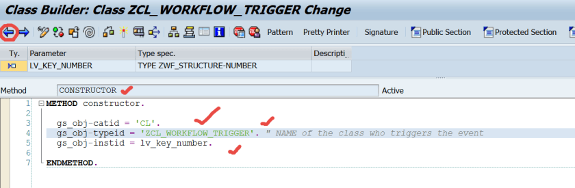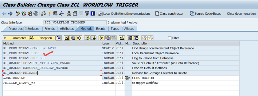 Step4. To enable a class to trigger work flow, it has to implement interface IF_WORKFLOW. When it is implemented it also implements INTERFACE : BI_OBJECT and BI_PERSISTENT.