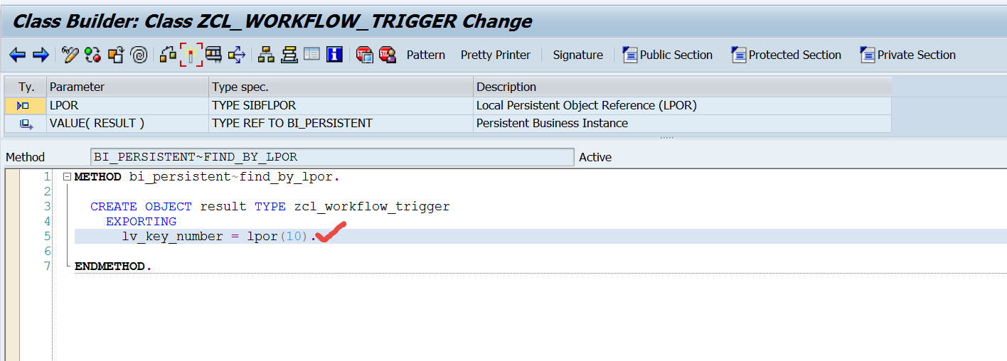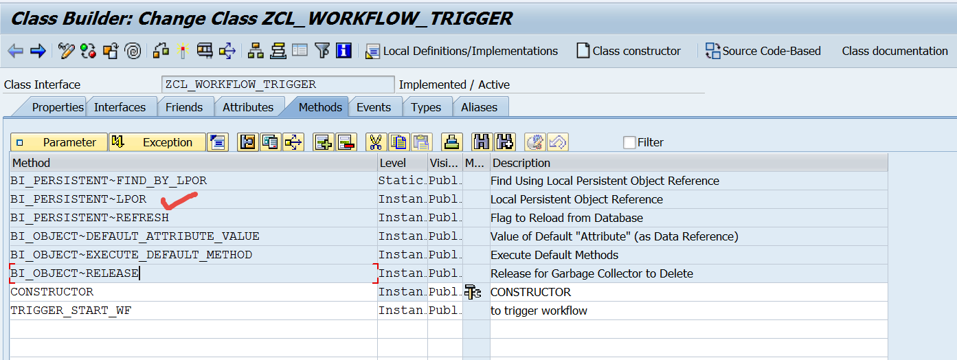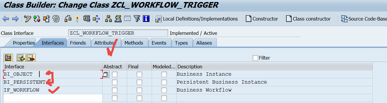 Step4. To enable a class to trigger work flow, it has to implement interface IF_WORKFLOW. When it is implemented it also implements INTERFACE : BI_OBJECT and BI_PERSISTENT.
