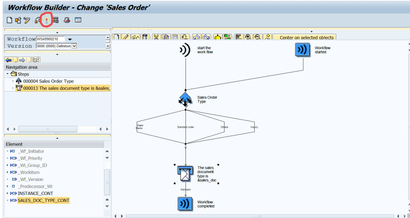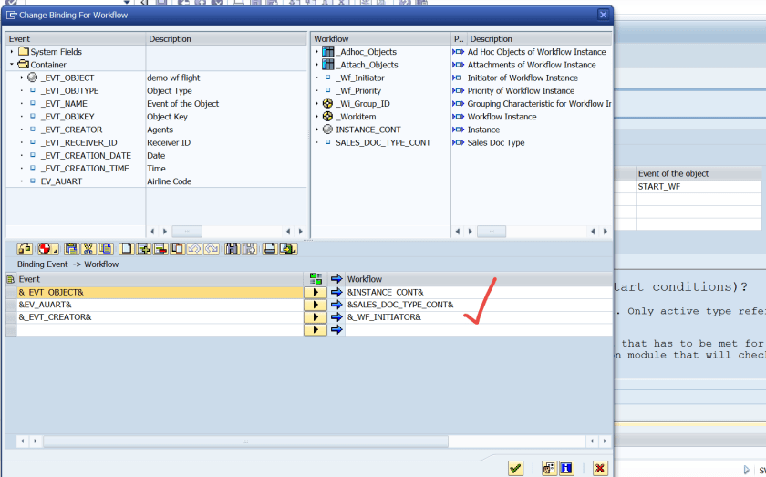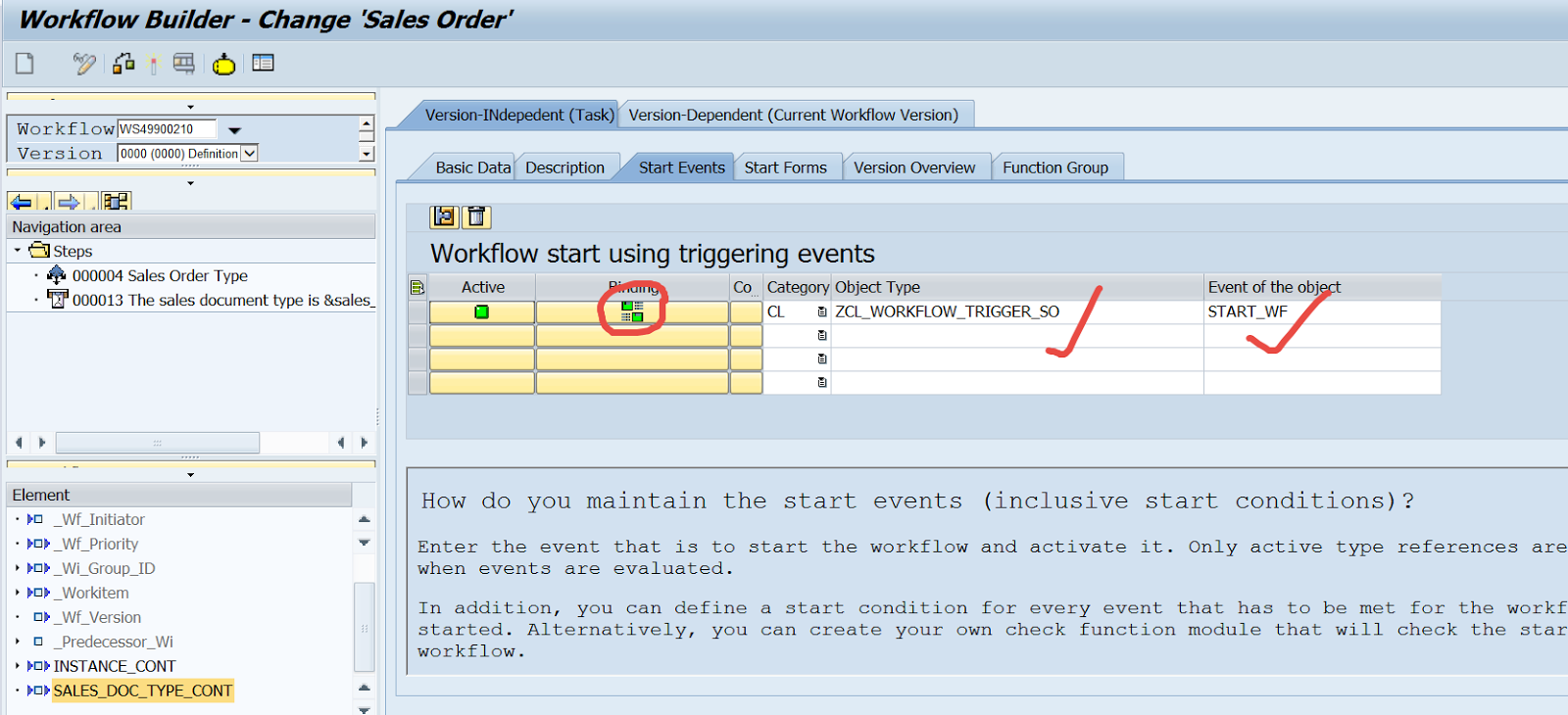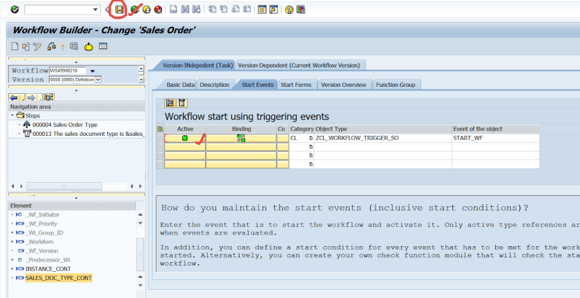 Go to the header of the work flow. Maintain the start event and finish the Binding. Activate and save. Go back.