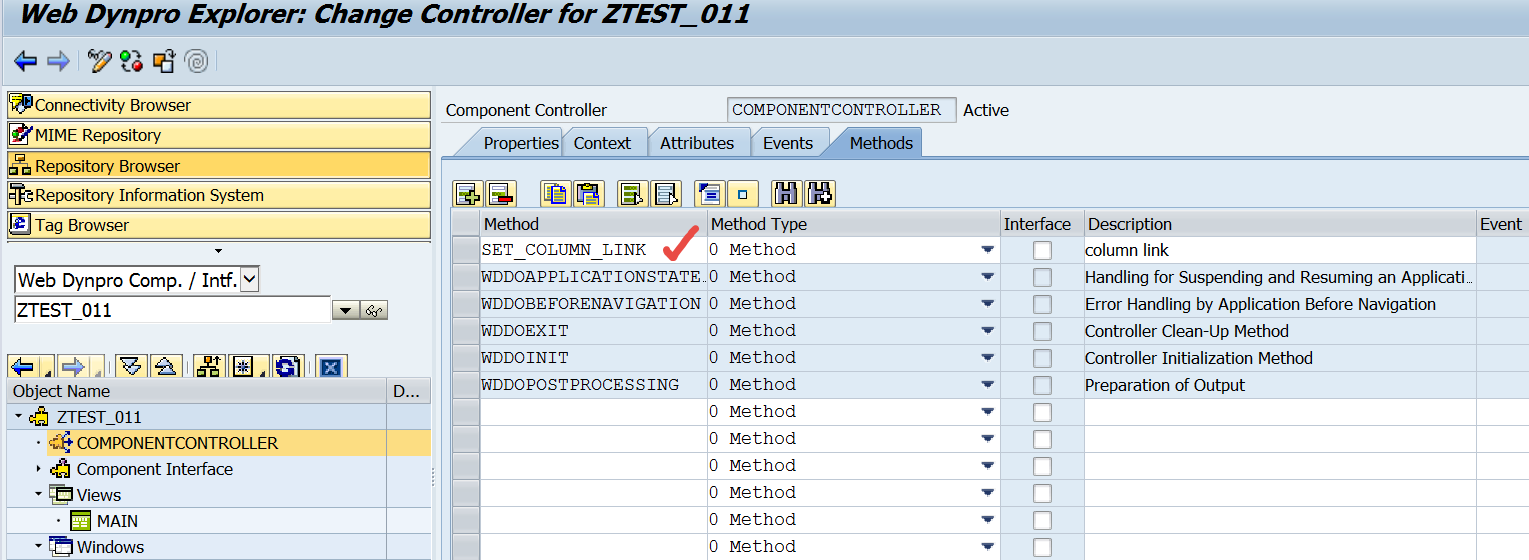 To set LINK TO ACTION to a filed, create a new method like SET_COLUMN_LINK’ in the component controller methods.