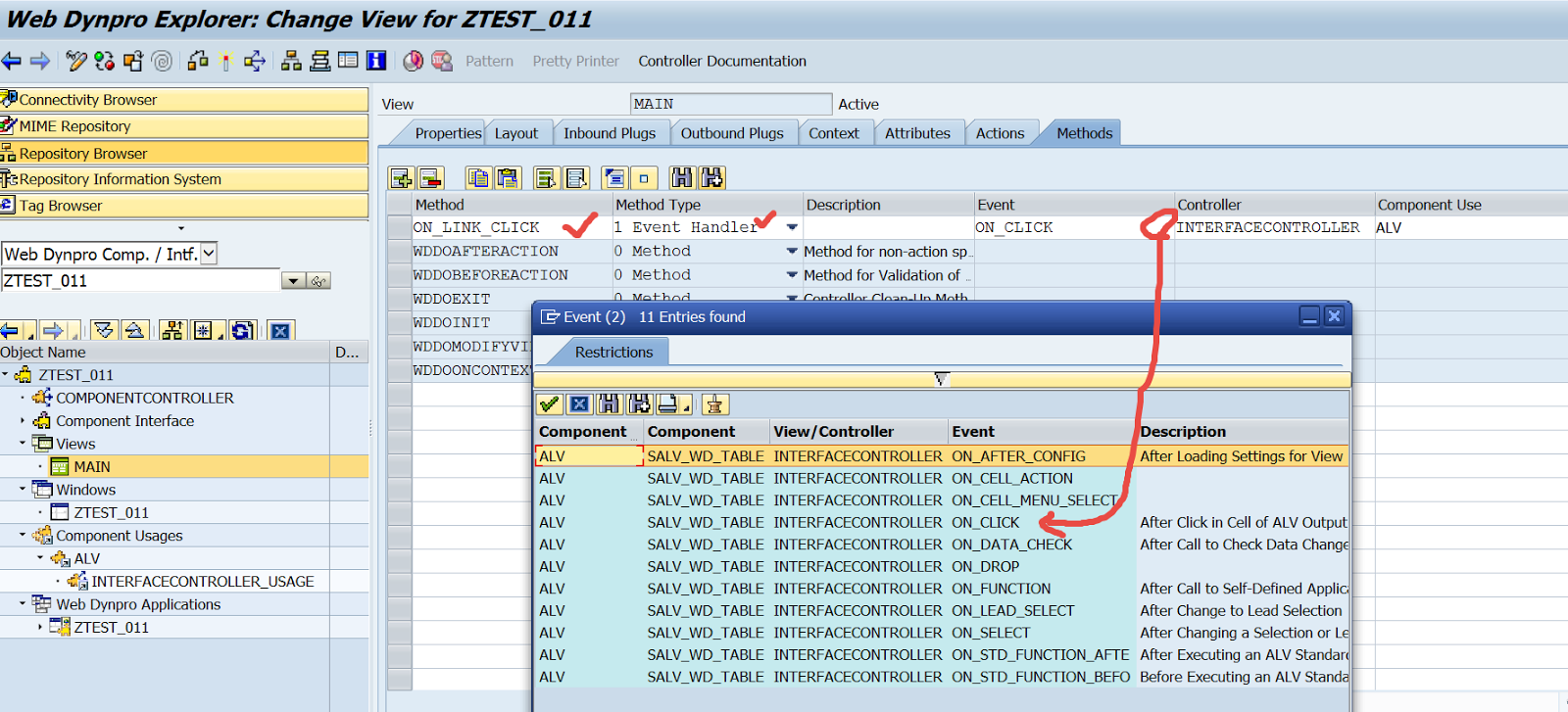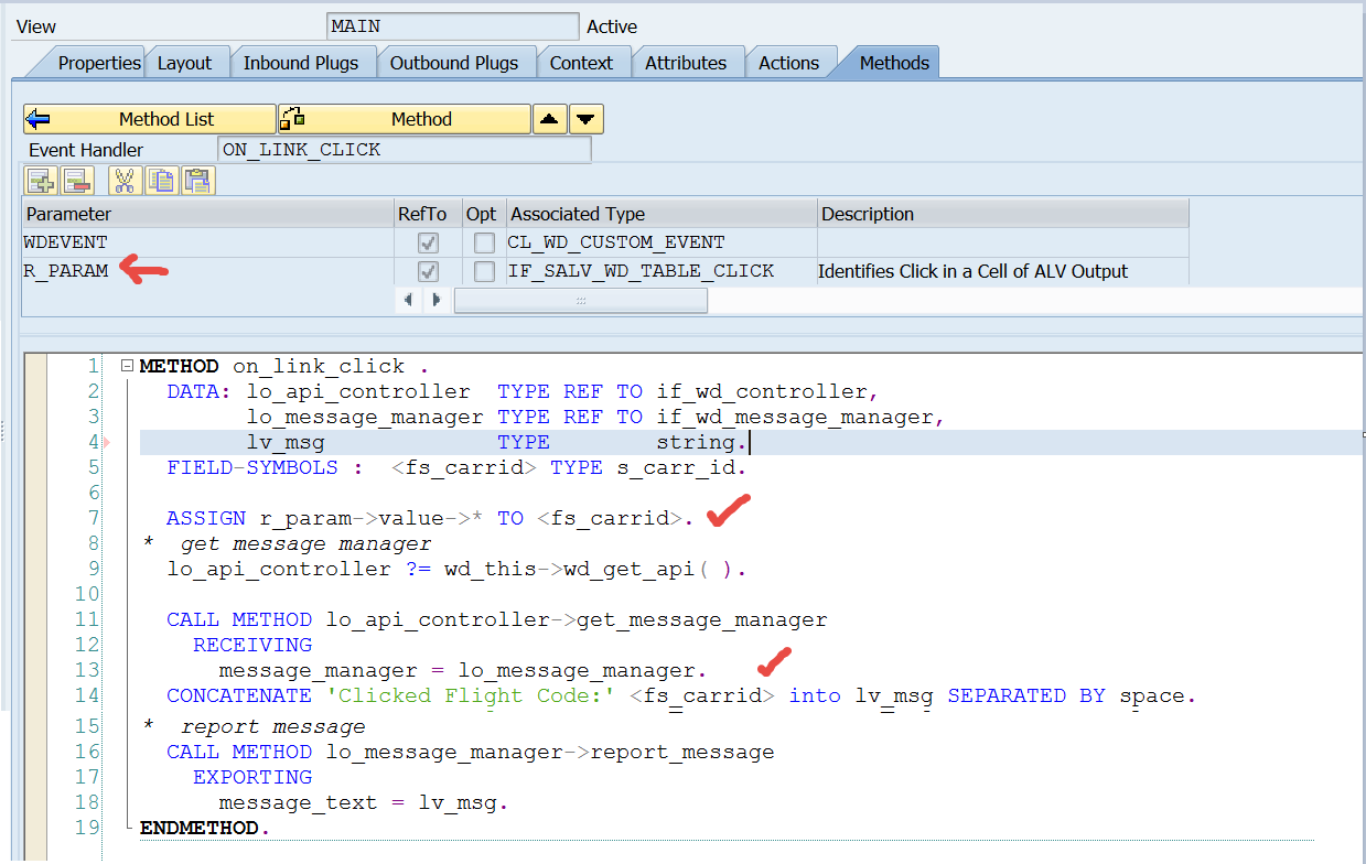 In the view Methods, add a new event handler view for the event ON_CLICK. which can be obtained form the F4 help.